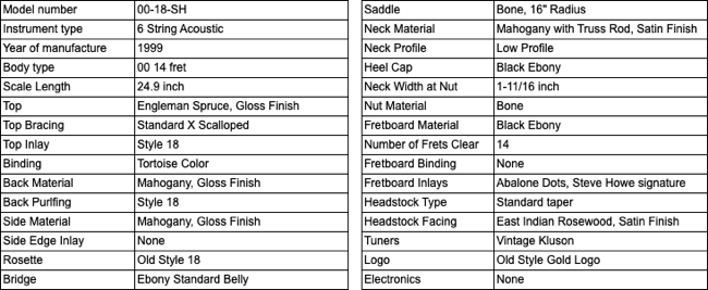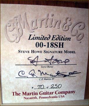 In 1999 Martin produced a limited edition of 250 guitars designated at the 00-18SH Steve Howe signature model. The long time guitarist of Yes fame has played a 1953 model 00-18 as his main acoustic since the very beginning of his career. This limited edition features most of the design elements of Steve's own guitar. A specially selected Englemann spruce top is matched to solid mahogany back and sides. The top is finished in a vintage toner and set off by tortoise binding and pickguard. Original style rosette and inlays from 1953 are used, as is vintage style chrome Kluson tuners. Steve Howe and C.F. Martin have personally signed the labels and Steve's signature is also delicately inlayed at the 18th fret. Bone nut and saddle contribute to a sound that is pure small bodied vintage Martin and the detail and finish work is exquisite.